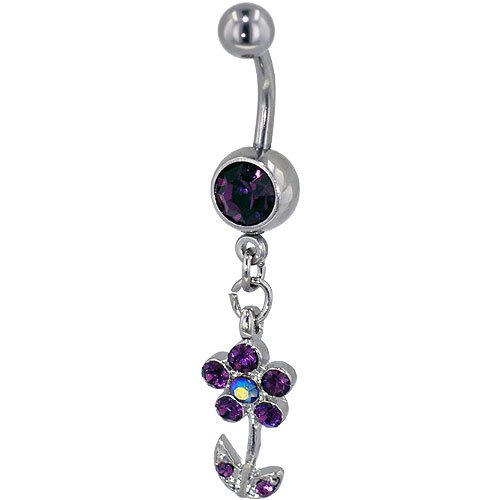Belly button rings are one of America's hottest fashion trends, and the Pugster Purple Crystal Spring Flower Dangle Belly Button Ring is one of the hottest around. With a flower dangle studded with purple Austrian crystal rhinestones decorating the 10mm 316 surgical steel curved barbell, this belly button ring will be both comfortable and stylish. Wear your belly button ring under your shirt as your own sexy secret, or let everyone see your navel decoration. Either way, your Pugster belly button ring is the perfect belly button ring for the job. Like all Pugster belly button rings, the Purple Crystal Spring Flower Dangle Belly Button Ring is available for both retail and wholesale purchase.