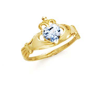 14k Heart Aquamarine-Blue Birthstone Claddagh Ring - Size 7.0 - in 14k Yellow Gold - Synthetic Stone - - JewelryWeb Style: CCR15588YH7 - FREE gift-ready jewelry box