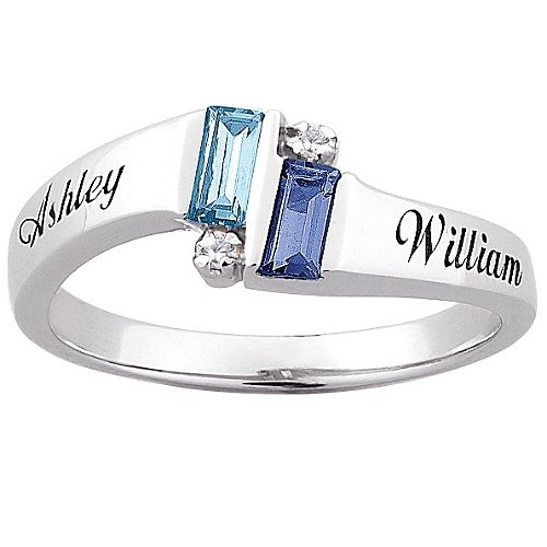 Enjoy the contemporary sentiment of this Sterling Silver Couple's Emerald-cut Birthstone Ring with Diamond Accent. Round diamonds (approx. 1mm) are nested atop crystals in a shimmery setting. Two names (one on each side) can be engraved to add a romantic touch. Choose crystals that represent birthstone colors or simply the colors you love! Sterling Silver Couple's Emerald-cut Birthstone Ring with Diamond Accent Features: Measures approx. 1/4"L x 5/8"W x 1/8"H; tapered shank 1/16"W Personalization: 2 names, up to 10 letters each and corresponding color crystals Available in ring sizes 5, 6, 7, 8, 9 and 10 Black accented Polished finish Rhodium-Plated Stamped .925 Made in China Boxed