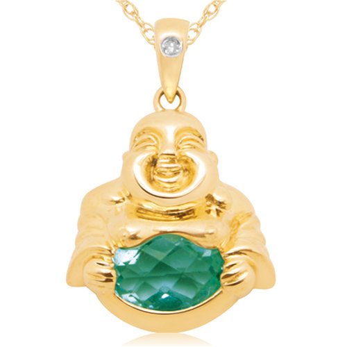Let this Buddha birthstone pendant inspire a joyful outlook. Crafted in polished 10 karat yellow gold, the smiling Buddha holds a checkerboard-faceted stone of brilliant green created emerald, the birthstone for May. With its bright pop of color, this piece will inspire your wardrobe too. The pendant dangles below a diamond-accented bail and presents on an 18-inch light rope chain.