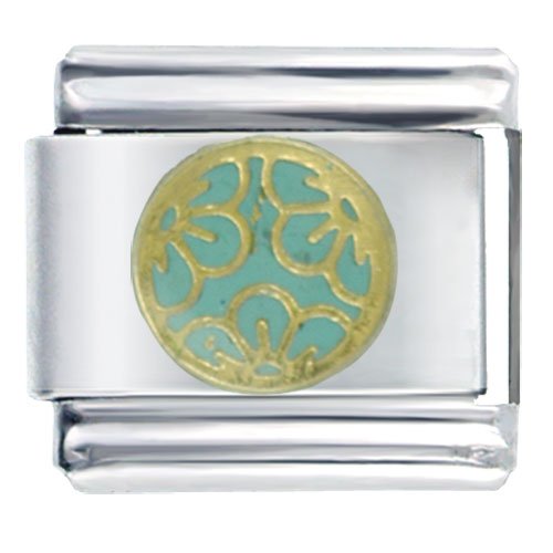 An elegant flower pattern medallion in gold trim over an aqua blue background. Authenticated by Pugster Inc. Crafted in a similar style that fits all major brand italian charms.